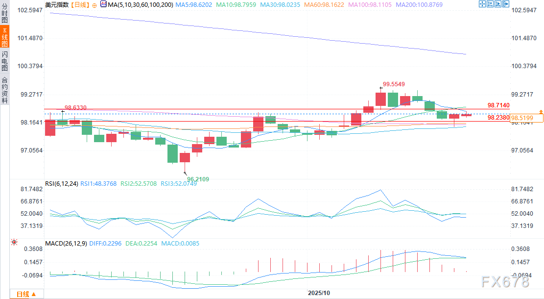 汇通财经APP讯——周一(10月20日)美盘时段,美元指数(DXY)小幅走低,测试98.238至98.714之间的关键技术区间。价格走势始终局限在这一回调区间内,交易员同时权衡日本和欧洲的政治动态、中美贸易关系企稳的信号,以及债券市场的谨慎情绪。